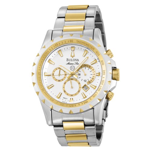 Exquisitely polished gold tones stand out against this fine Bulova dress watch's white and silver-tone backdrop. A stainless steel band allows highly polished gold-tone accent stripes to capture the eye. A stainless steel case houses a white dial framed by a polished, silver-tone stainless steel bezel with triangular accent cuts. Polished gold-tone push pieces and a gold-tone tachymeter ring add to the golden appeal of this dress watch. Gold-tone shape hour indicators, black stick minute markers, and luminescent gold-tone skeleton hands on the dial create a sophisticated look. Three subdials and a date window at the four o'clock position complete this stunning timepiece. The Bulova Men's Marine Star Chronograph Watch is water resistant to 330 feet.